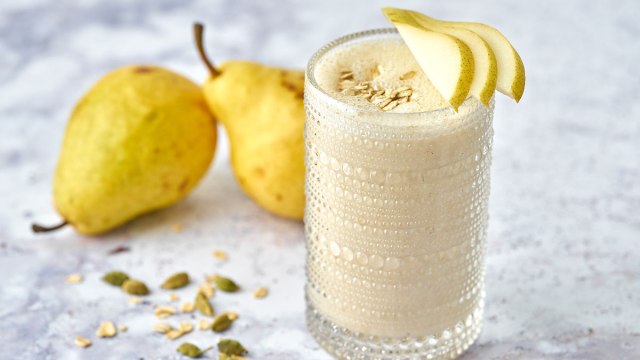 This vegan treat is just as satisfying as it is nourishing! A ripe pear is blended with cauliflower (sounds gross, but trust us), almond milk, dates, almond butter, vanilla, and cardamom resulting in a creamy, nutty, and just sweet enough smoothie that helps you get moving!