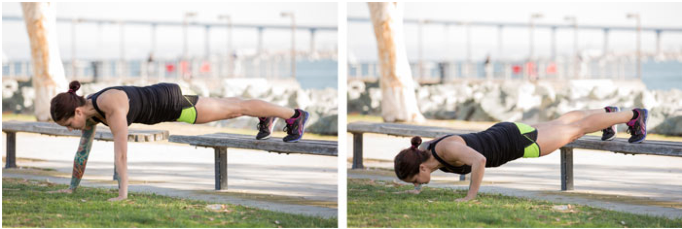 Find a bench or short wall. Place the hands on the bench, with hands and feet positioned shoulder-width apart. Pack the shoulders, engage the lats, squeeze the glutes and legs; lower the chest toward the bench. To emphasize the triceps, keep the elbows in close to the torso throughout the movement.